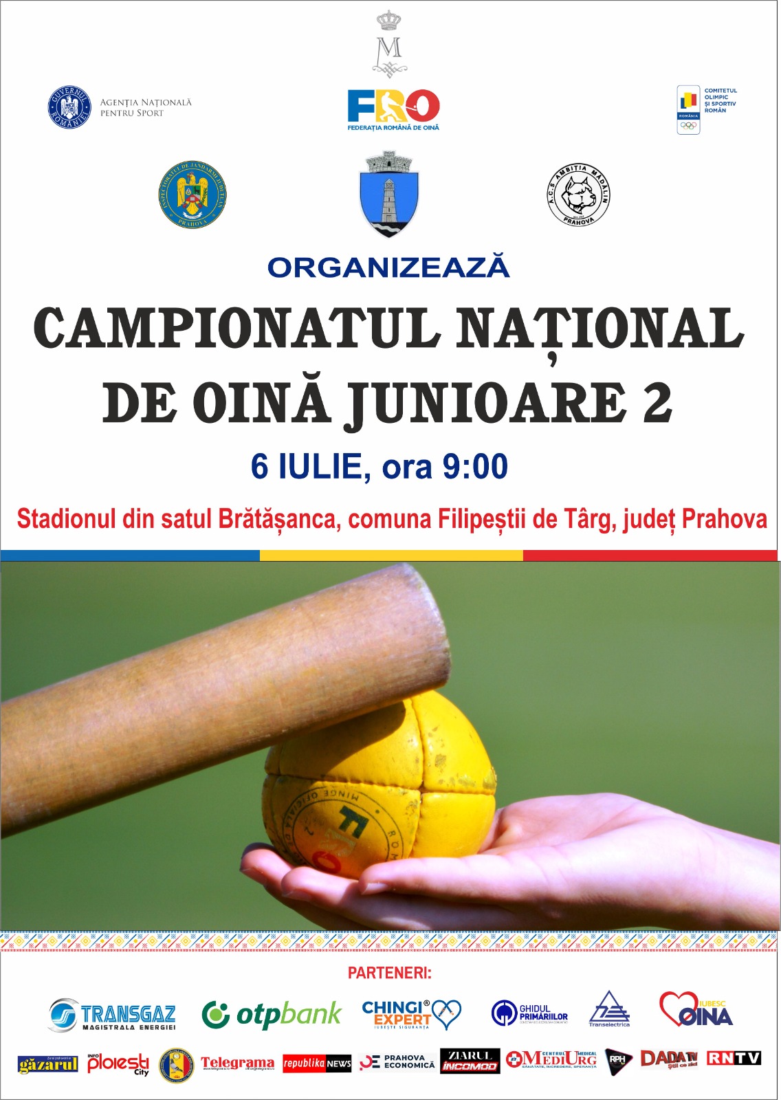 Sâmbătă, 6 iulie a.c., ora 9.00, pe stadionul din satul Brătășanca, comuna Filipeștii de Târg, județul Prahova, va avea loc Campionatul Național de oină-junioare 2.